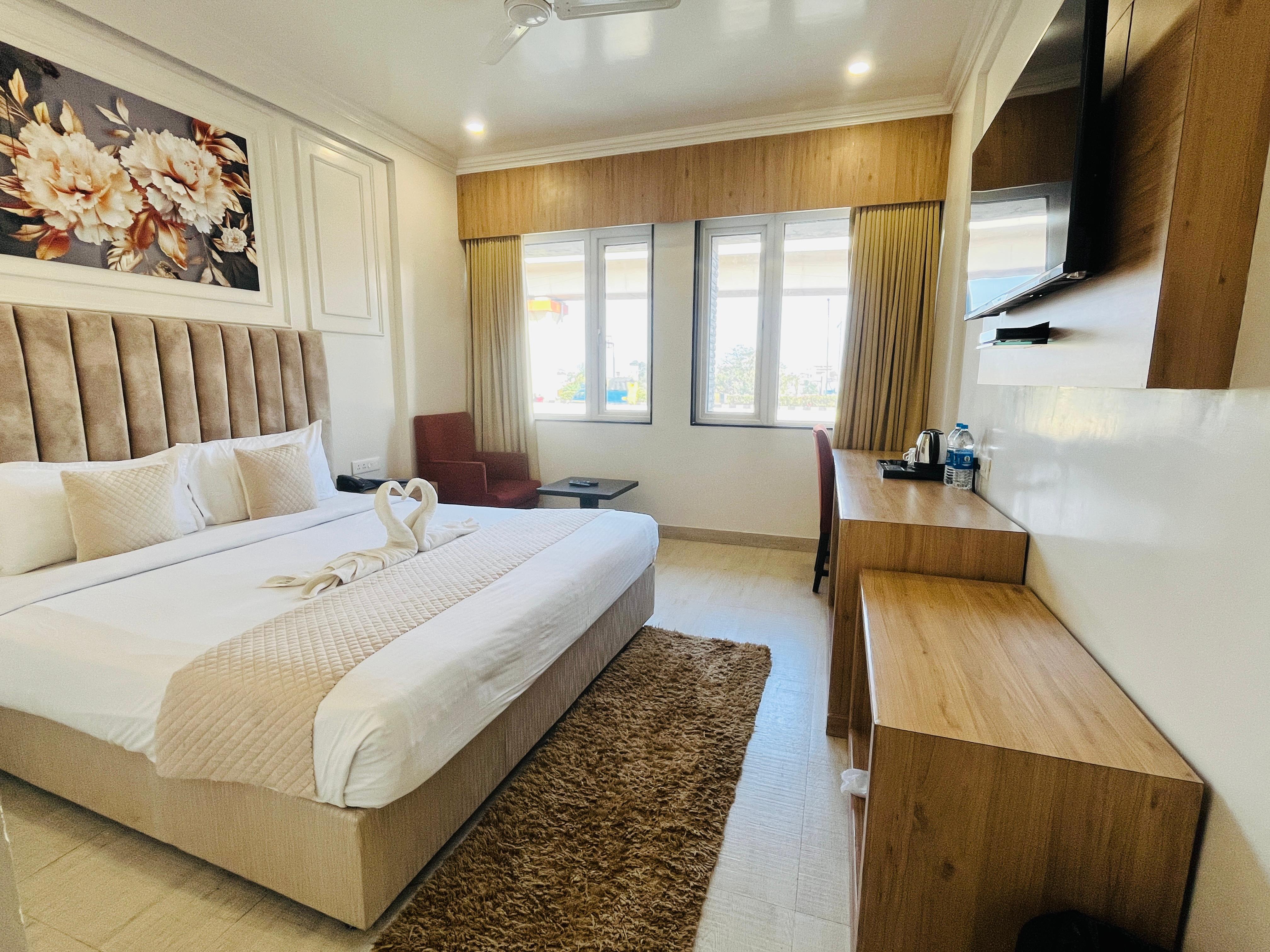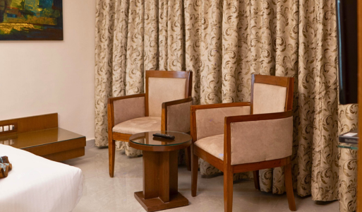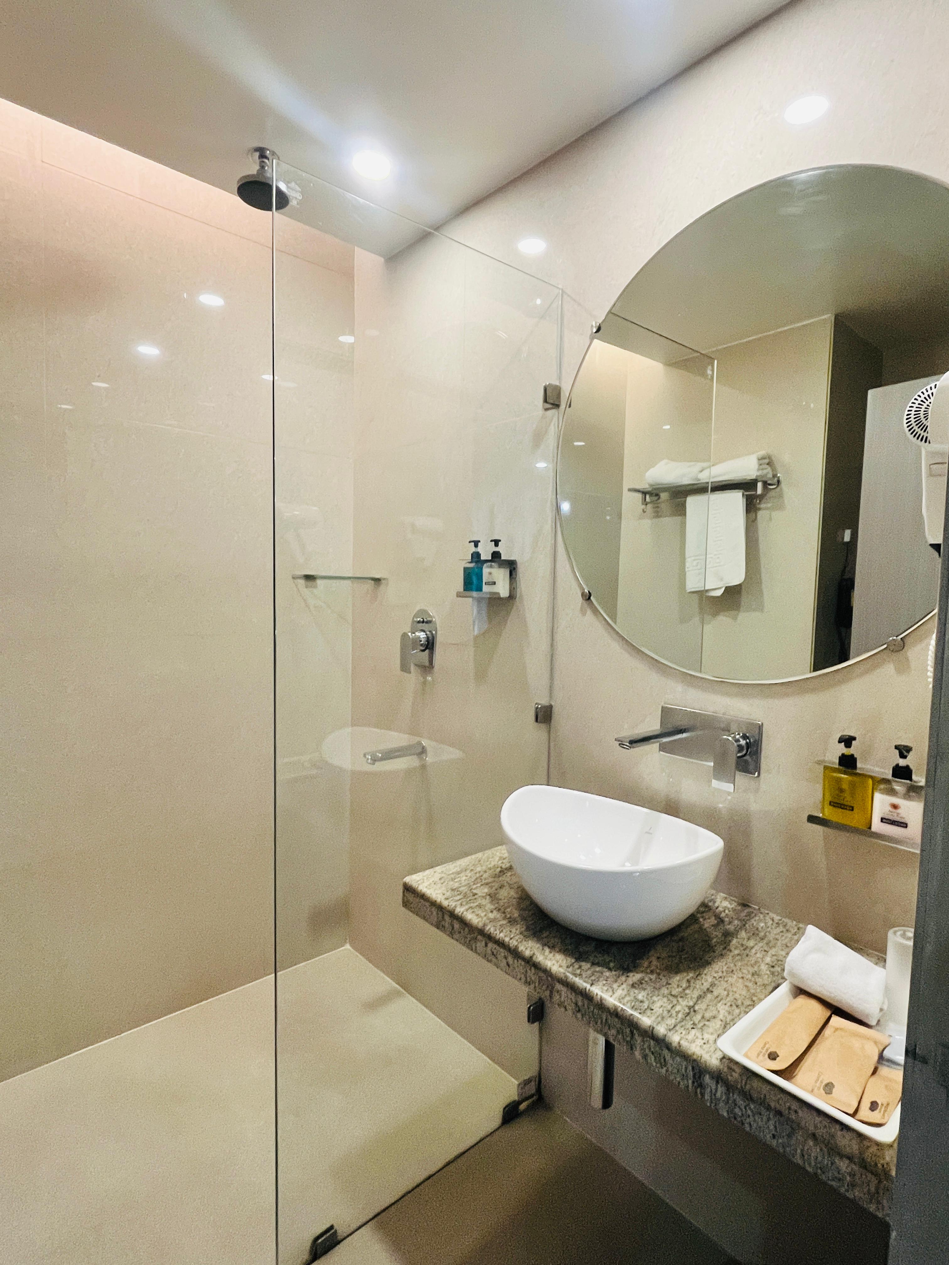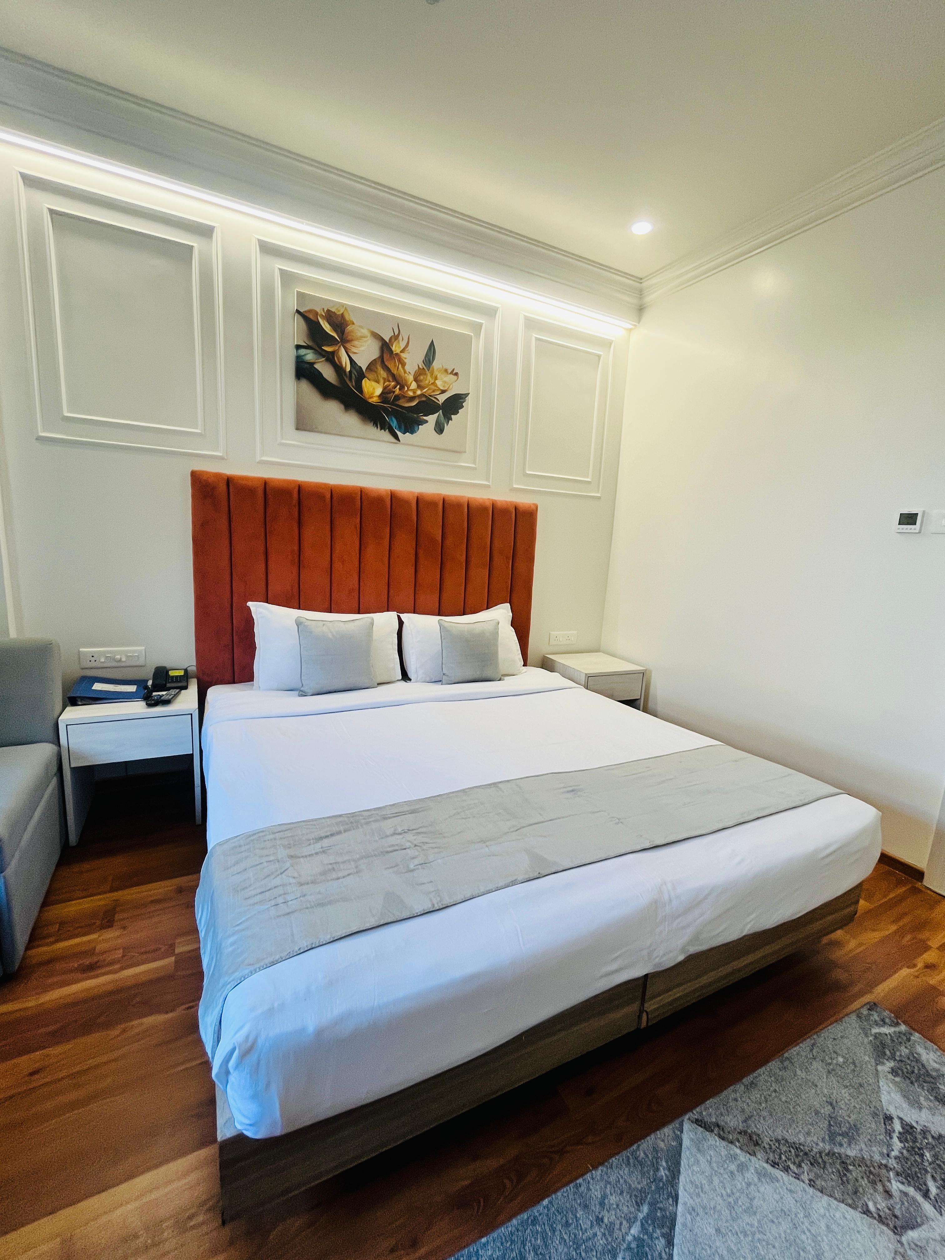 Experience urban luxury in our spacious Superior Suite, featuring a stylish living area with plush seating, dining space, and amenities. The elegant marble bathroom, flooded with natural light, adds a touch of sophistication.