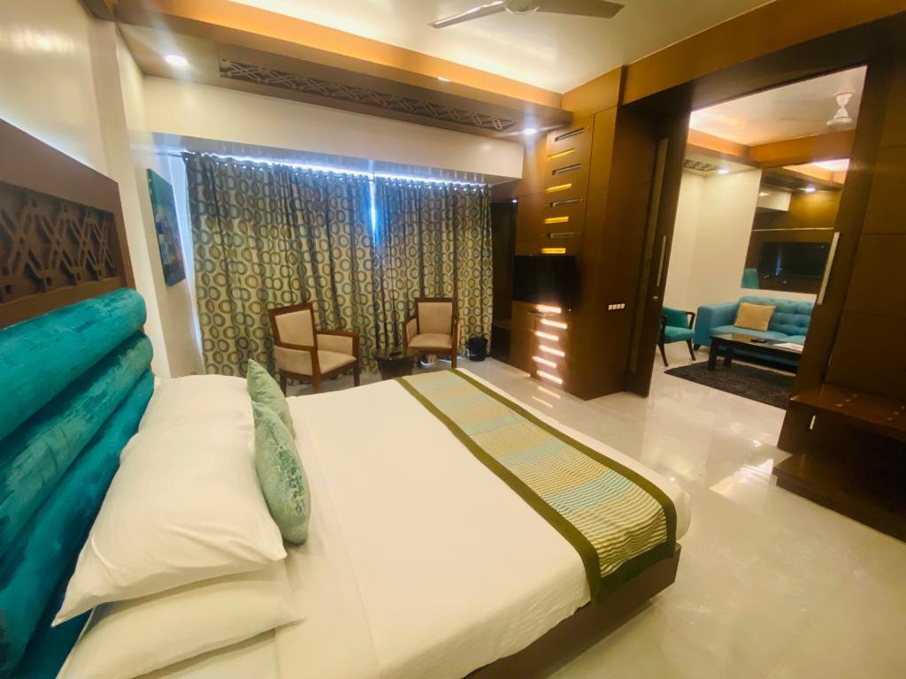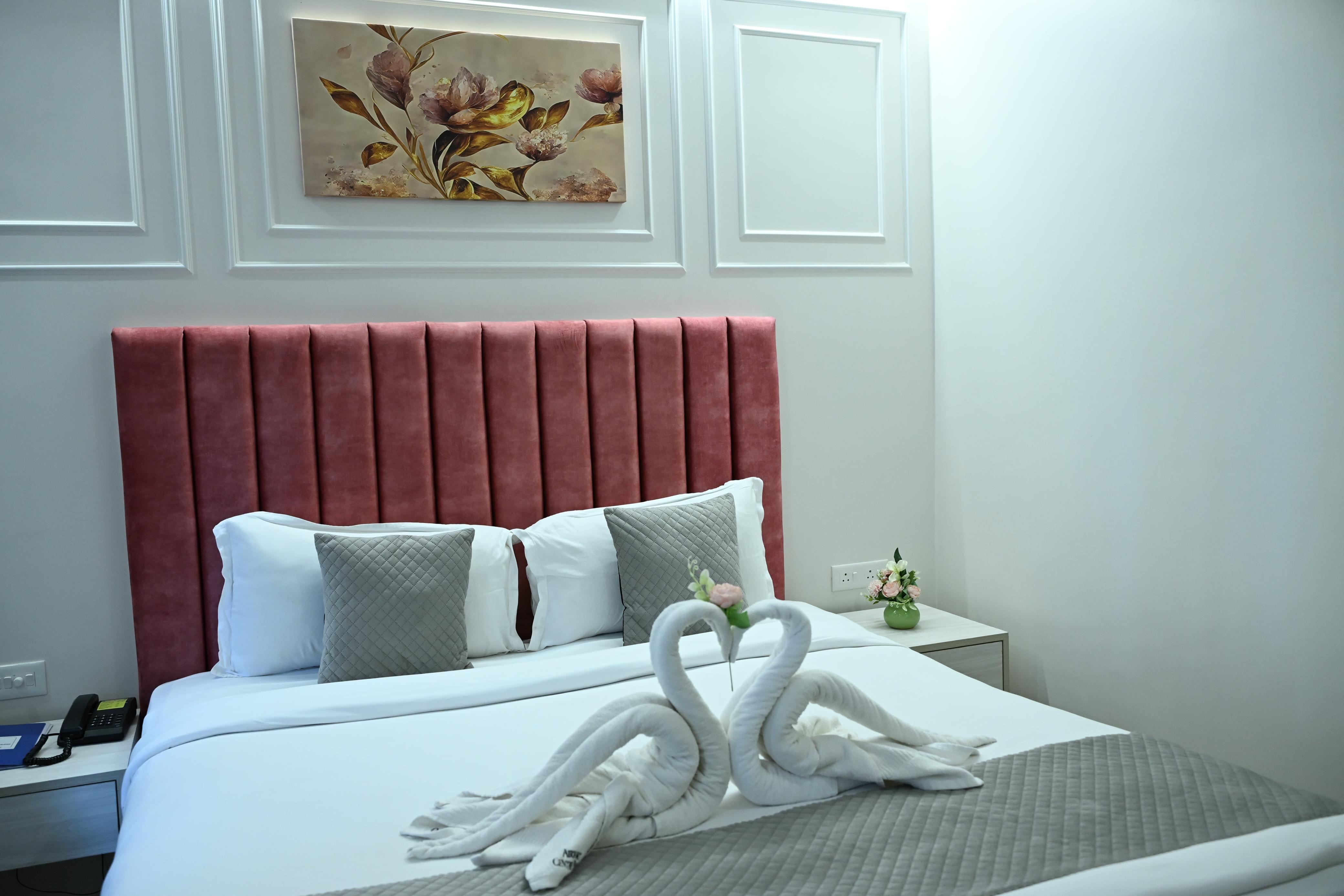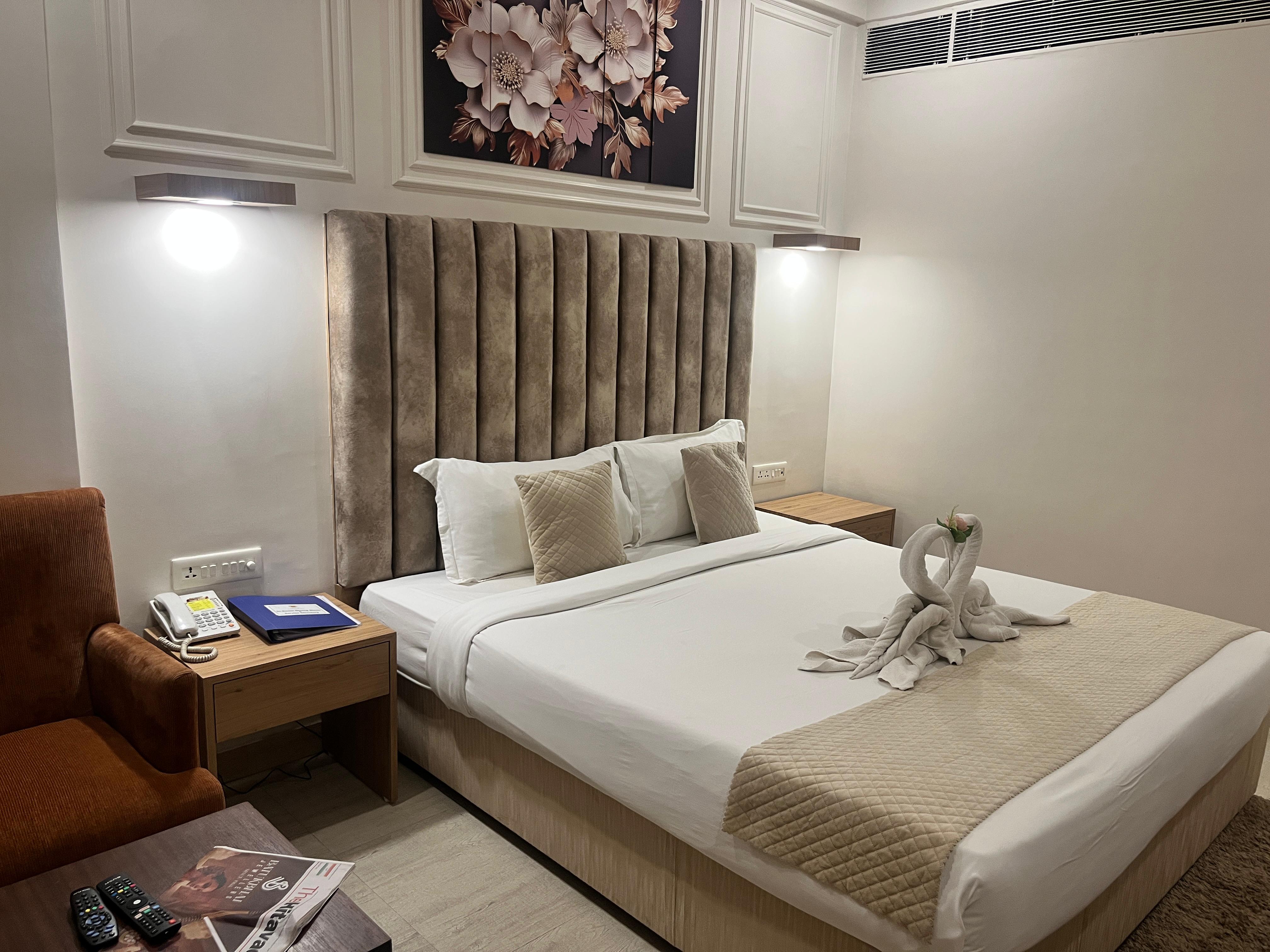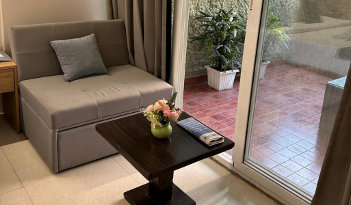 Experience urban luxury in our spacious Superior Suite, featuring a stylish living area with plush seating, dining space, and amenities. The elegant marble bathroom, flooded with natural light, adds a touch of sophistication.